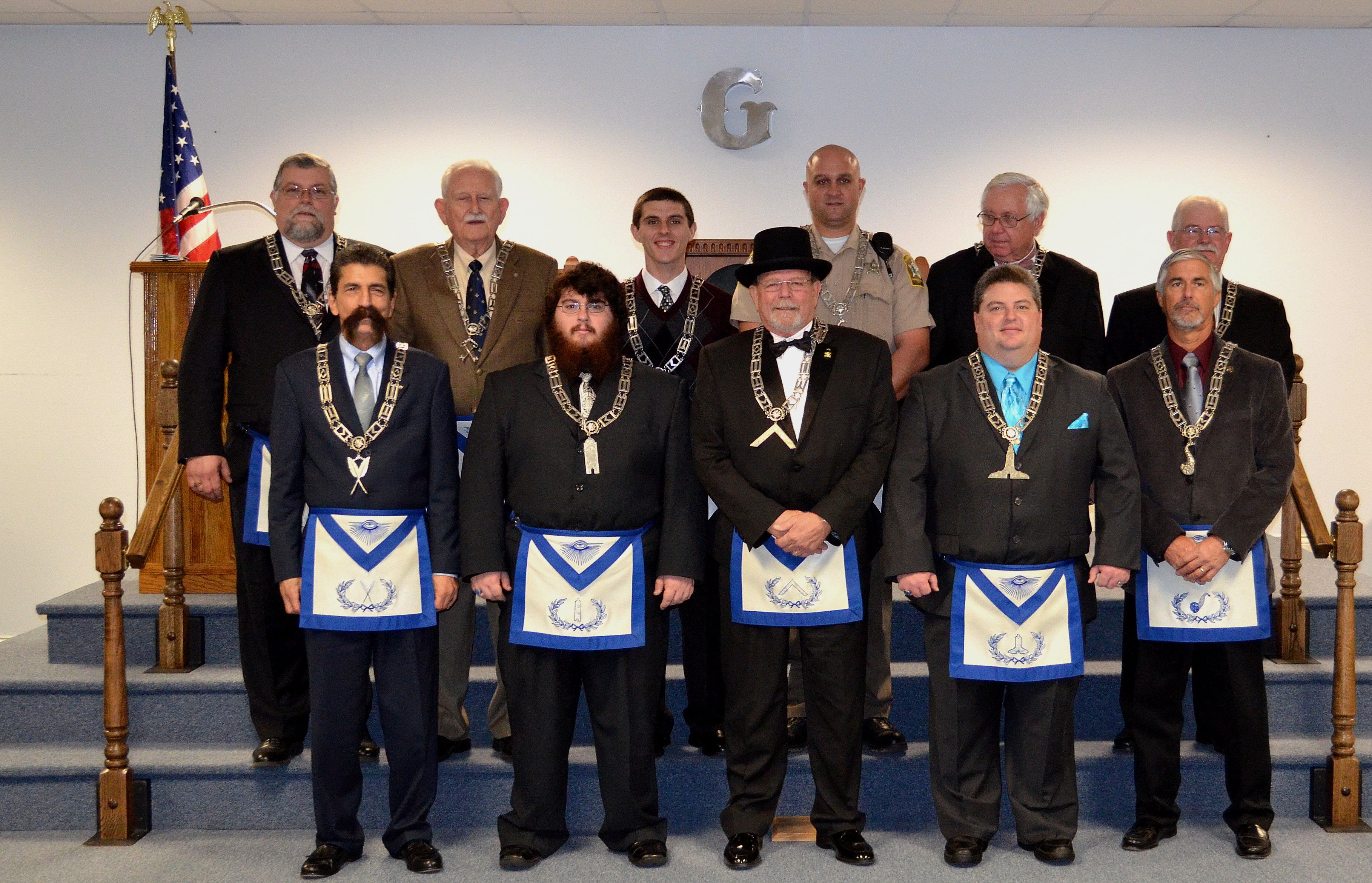 First Row left to right: Secretary, Vincent J. D’Andrea; Junior Warden, David G. Nash; Master, Mitchell A. Elliott; Senior Warden, Thomas L. Nash, Jr.; Junior Steward, Perry L. Sams. Second Row left to right: Junior Deacon, Daniel B. Johnson; Treasurer, Robert L. Little; Senior Deacon, John R. Nash; Senior Steward, Dustin S. Grooms; Tyler, Stephen A. White, PM; Chaplain, Douglas E. Martin, PM.
